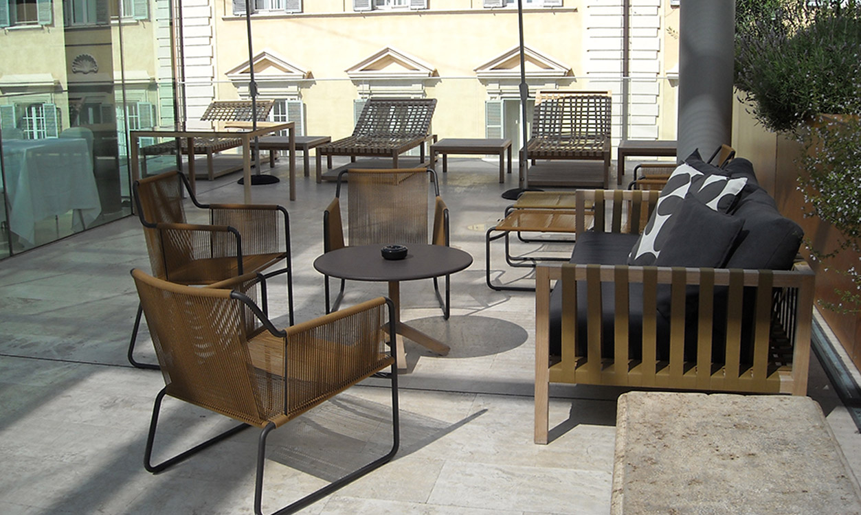 I mobili per esterno di RODA, grazie al loro design elegante ma naturale, si armonizzano alla perfezione in questo ambiente naturalistico, diventandone una parte integrante ed essenziale.